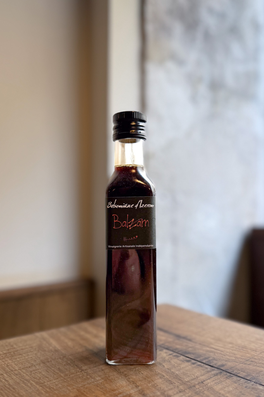 Balzam est issu du mariage entre vinaigre de vin vieux et moût de raisin, vieilli en fûts de chêne et de cerisier. Il offre une touche acidulée et gourmande, idéale en vinaigrette ou en déglaçage.