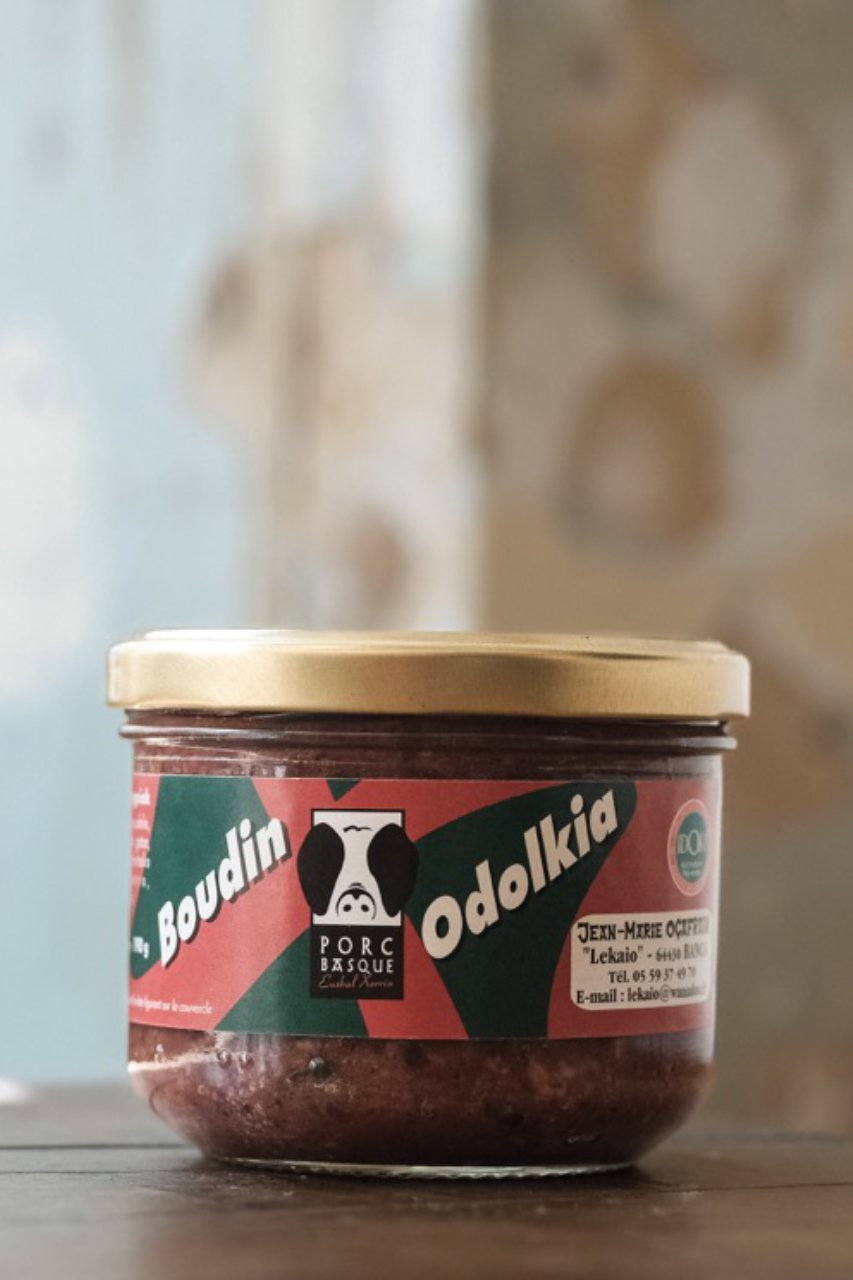 Boudin de porc Kintoa de Jean-Marie Oçafrain. Après une longue et douce cuisson de la tête, du cœur et de la couenne, le tout est haché, un peu de sang ajouté puis assaisonné avec des épices naturels. Aucun additif. Avis aux amateurs!