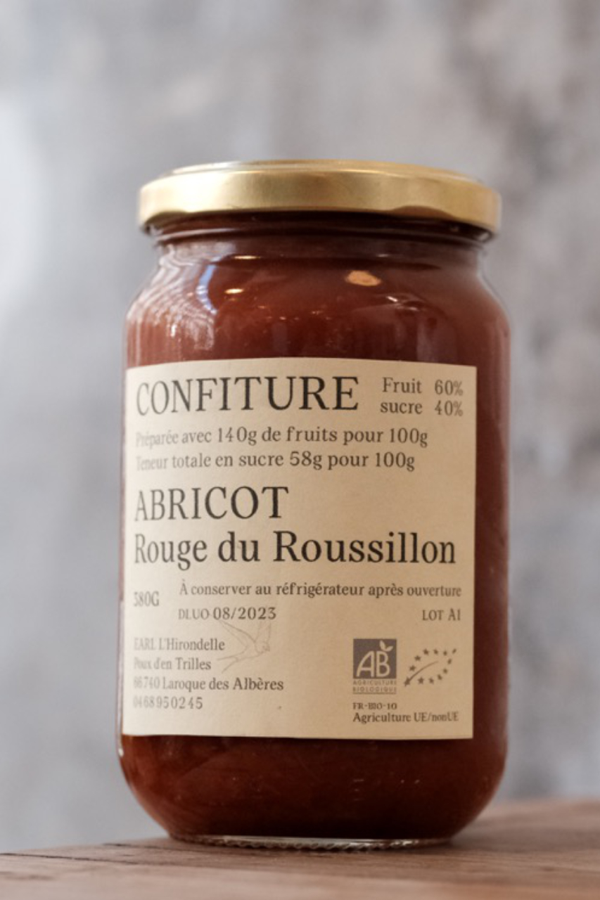 Confiture d’abricots rouges du Roussillon de Christine et Claude Cribeillet, arboriculteurs à Laroque des Albères dans les Pyrénées Orientales. Des pêches sanguines gorgées de soleil et bichonnées en agriculture biologique. Christine met un maximum de fruit dans ses confitures (60% pour cette confiture) et évidemment aucun additif.