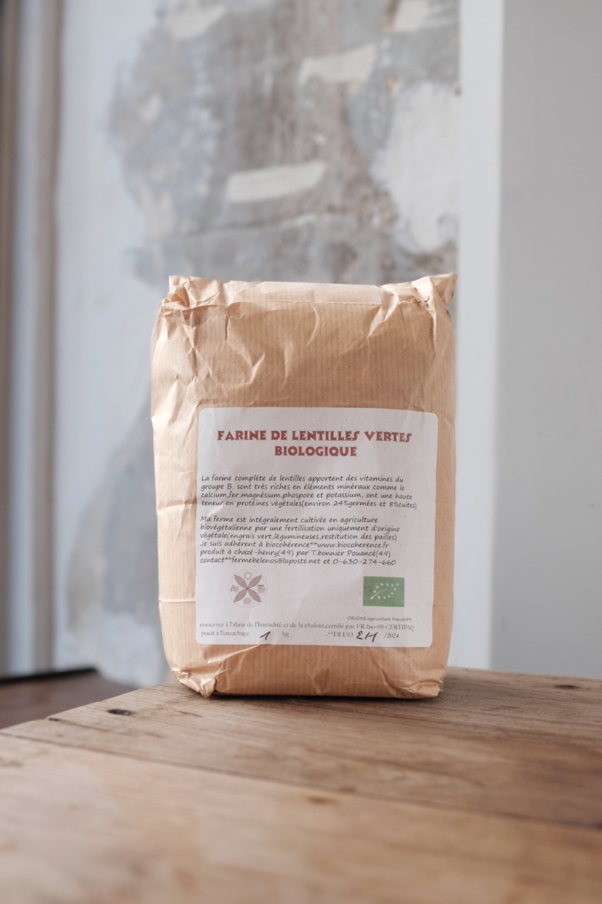 Farine complète de lentilles vertes cultivées au champ puis moulue par Thierry Bonnier (49). Très riche en minéraux et protéines végétales.