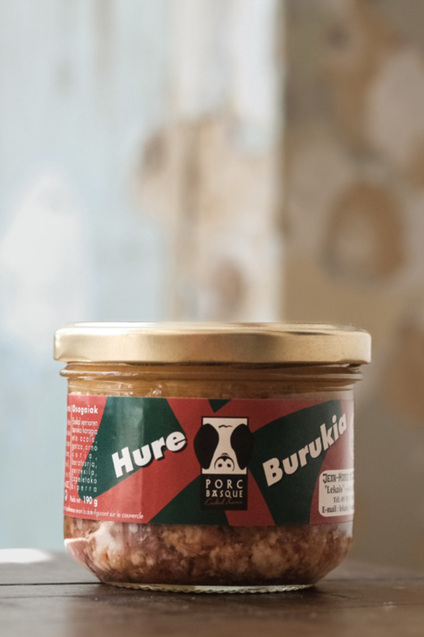 Sur les hauteurs de Banca, à la ferme Lekaio, Jean-Marie Oçafrain élève depuis 2005 des porcs basques Kintoa en totale liberté, sur des parcours enherbés et des sous-bois. Les porcs y trouvent une partie de leur alimentation notamment à l’automne (châtaignes et glands). Leur alimentation est complétée de céréales bio (maïs, blé, son, tourteau de colza). Il commercialise ses porcs en carcasse que vous pouvez retrouver dans nos restaurants ou bien en préparation charcutière comme ici.