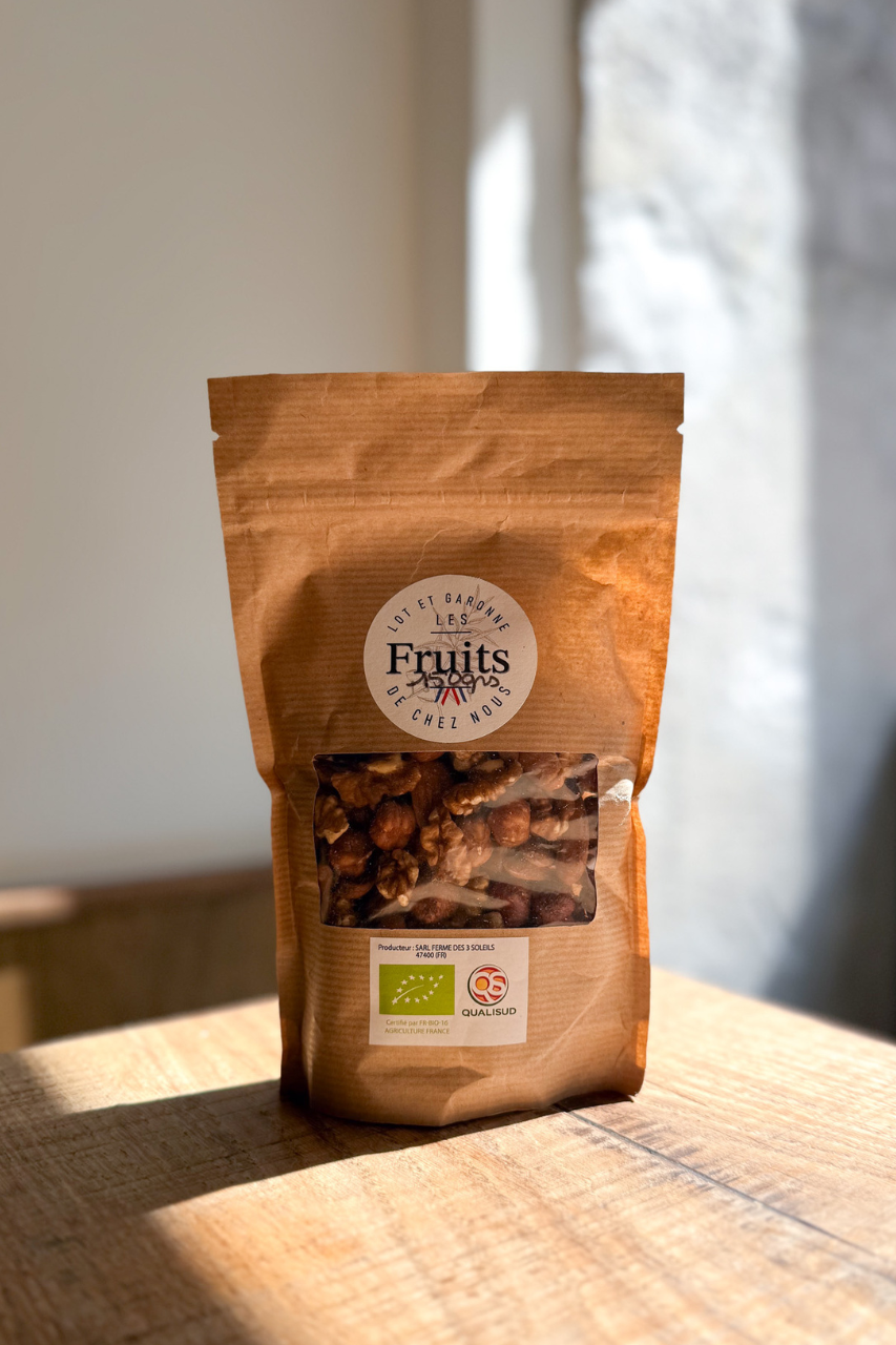 Mélange de d’amandes, noix et noisettes, décortiquées et torréfiées par la famille Tesson à la ferme des 3 Soleils.