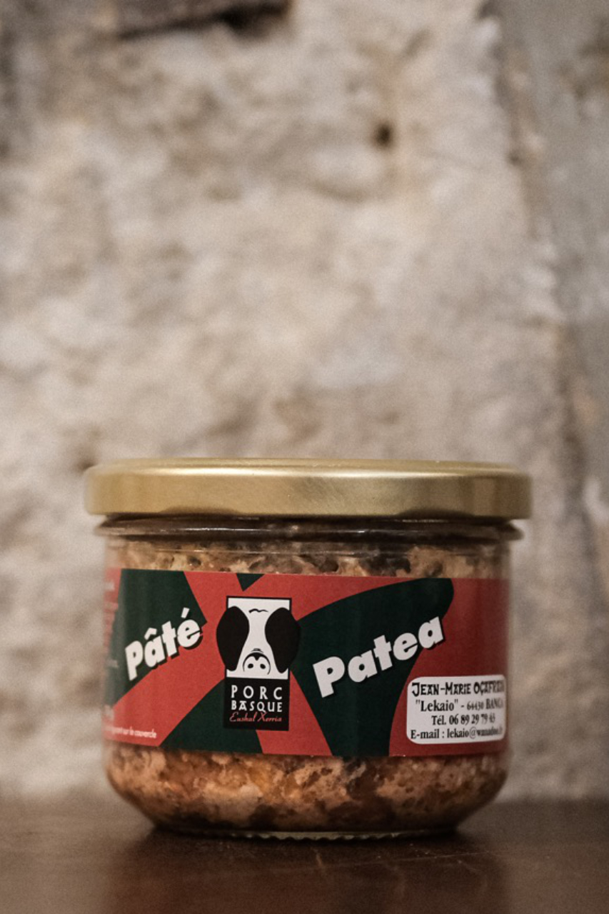 Sur les hauteurs de Banca, à la ferme Lekaio, Jean-Marie Oçafrain élève depuis 2005 des porcs basques Kintoa en totale liberté, sur des parcours enherbés et des sous-bois. Les porcs y trouvent une partie de leur alimentation notamment à l’automne (châtaignes et glands). Leur alimentation est complétée de céréales bio (maïs, blé, son, tourteau de colza). Il commercialise ses porcs en carcasse que vous pouvez retrouver dans nos restaurants ou bien en préparation charcutière comme ici.