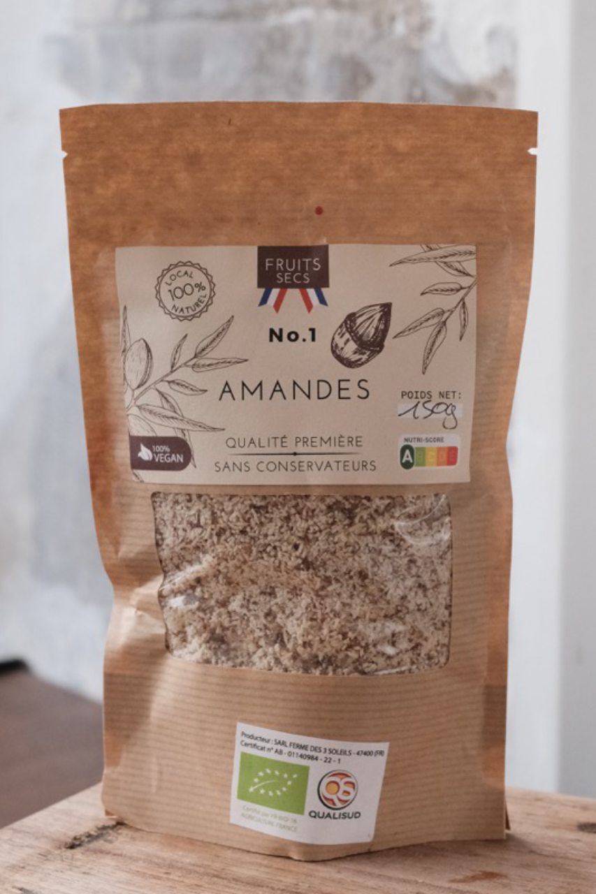 Poudre d’amandes bio du Lot et Garonne et concassées par la famille Tesson à la ferme des 3 Soleils.