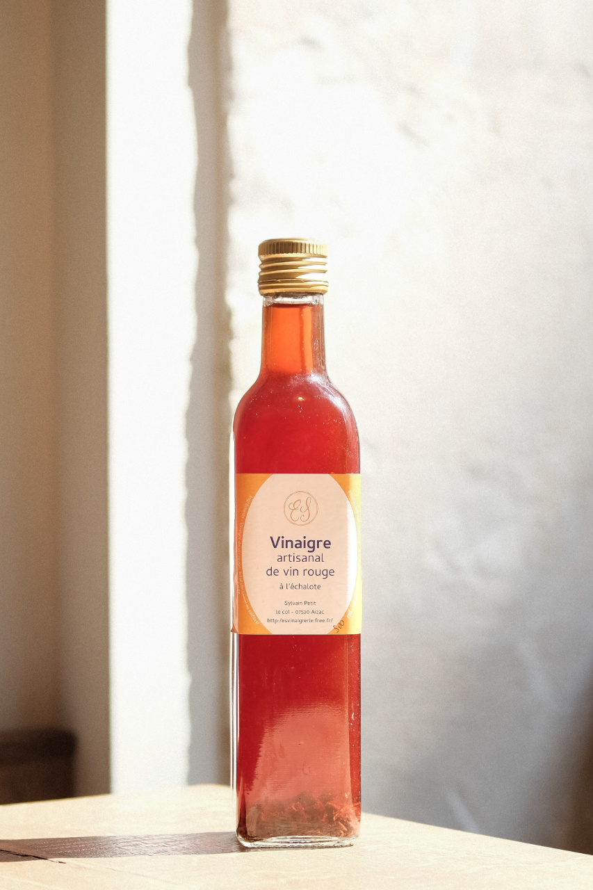 Un vinaigre authentique et naturel, produit uniquement selon la méthode ancestrale dite « orléanaise » avec des vins rouge issus de vignerons “nature” ardéchois, avec de l’échalote, par Sylvain Petit (07).