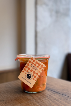 Cuisinée artisanalement dans un atelier bio gersois, cette sauce tomate utilise des tomates anciennes non hybrides pour un goût prononcé, légèrement vineux et renommé comme la variété la plus savoureuse.