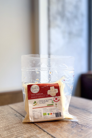Tofu fermier au piment doux et ail à base de graines de soja bio des Yvelines cultivées et transformées à la ferme Les Petits Evaurys.